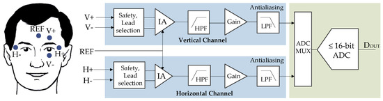 Figure 2 shows a typical EOG AFE using a low-resolution ADC, typically 16-bit or less. It consists of two identical channels, the horizontal channel to acquire the biopotentials corresponding to the horizontal movements of the eyes and the vertical channel for the biopotentials relating to the vertical eye movements.