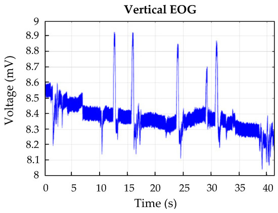 Disturbances caused by muscular actions, such as chewing, the opening or closing of the eyes, frowning, etc., considerably affectthe EOG signal recording [24,25,26,27,28]. The most important muscular action is blinking since it is involuntary, and although it does not modify the electrostatic potential of the eye, it can move the electrodes, creating electrode–skin interference. This causes the appearance of high-frequency artifacts. In addition, blinking (Figure 5) can be confused with a saccadic movement since it has the same frequency and amplitude and involves a reflex vertical movement of the eyeball [19]. Blinks can be detected during computerized processing, using mathematical tools such as wavelet transforms [29].