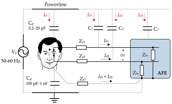 The capacitive coupling of the powerline is one of the main sources of interference present in the EOG registry. Figure 6 shows the human body connected to the measuring equipment by means of three electrodes including the capacitive interferences generated. The capacitive coupling with the body and the electrodes is the most influential aspect in the design of the biopotential amplifier circuit. This interference causes the appearance of displacement currents that flow to the ground through the electrode–skin interfaces and the patient’s body. This also causes common-mode and differential voltages to appear at the amplifier input, resulting in a new source of interference. The capacities associated with this type of coupling range from 100 pF to 1 nF, depending on the user’s position and the acquisition conditions. The capacities between the user and the powerline typically range from 0.2 pF to 20 pF. The capacitive coupling between the powerline and the AFE (C3) does not cause interference since the interfering current that circulates through it goes to the ground through the housing of the equipment, therefore not entering into it. This interference can be very high in case of using very long cables located near the powerline or the equipment to which they are connected [15,30].