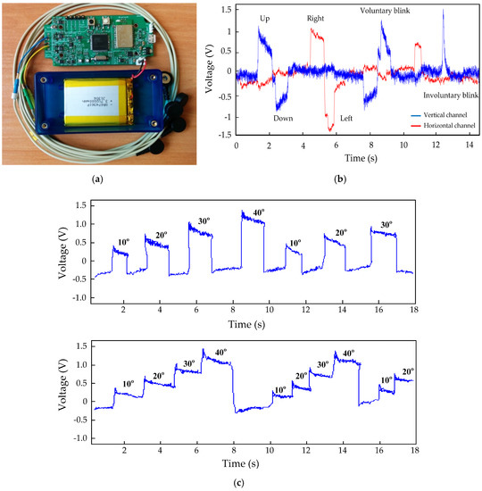 (a) A photo of the EOG system; (b) Characteristic EOG potential changes due to eye movement; (c) Saccadic movements corresponding to a 0°–10°–20°–30°–40° gaze sequence.