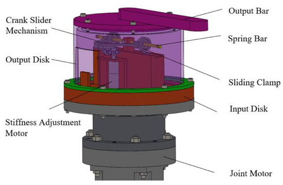 The mechanical design structure of SCM-VSJ is shown in Figure 1. The joint motor can drive the input disk to rotate through the reducer, the center of the spring bar is fixed with the center of the input disk. Both ends of the spring bar pass through the circular holes on both sides of the output disk, and the output bar is fixed to the output disk. Therefore, the joint motor can drive the output disk through the spring bar to realize joint position control. The stiffness adjustment motor is fixed on the connecting bracket of the input disk, after driving the stiffness adjustment motor, a pair of crank slider mechanisms can move symmetrically left and right through gear meshing transmission, therefore, a pair of sliding clamps can slide symmetrically left and right in the convex groove of the input disk. The contact force pivot point is formed by the contact between the sliding clamp and the spring bar, the driving stiffness adjustment motor can make the contact force pivot point of the left and right sides of the spring bar move symmetrically at the same time, and change the effective length of the spring bar, thereby changing the joint stiffness. We use symmetrical structure to change the stiffness of the joint, when the joint is subjected to external moment, the load impact on all parts of the joint will be more balanced. To prevent the spring bar from plastic deformation caused by excessive deformation, a baffle is set on the input disk and a U-shaped groove is arranged on the output disk.