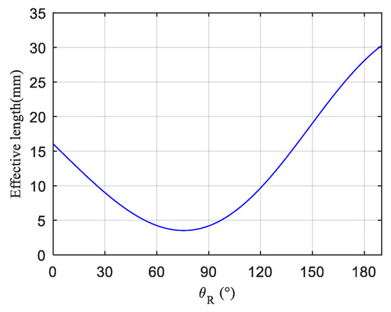 Substitute the parameters of Table 2 into Equation (27), the relationship between the effective length and the rotation angle of the stiffness motor can be obtained. To prevent interference of symmetrical crank slider mechanism, the range of stiffness motor rotation angle is set between [0°, 190°]. The relationship between effective length and stiffness motor rotation angle is shown in Figure 8.