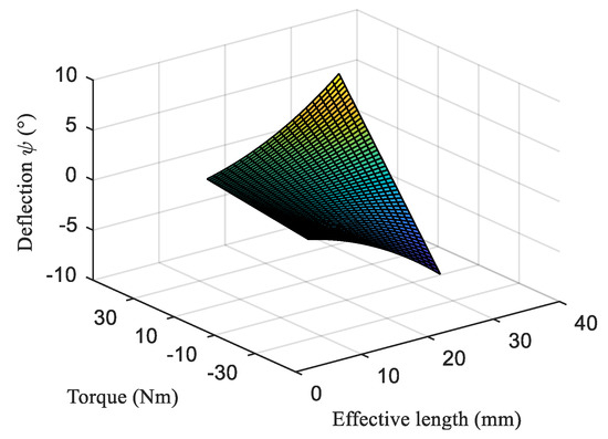 Considering the rated torque of the reducer of the joint motor and the adjustment range of the effective length, according to Equation (16), we can get the relationship between the passive deflection angle and the external torque and the effective length, as shown in Figure 9.
