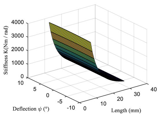Substitute the parameters of Table 2 into Equation (22), the relationship between the joint stiffness and the effective length and the passive deflection angle can be obtained, as shown in Figure 10.