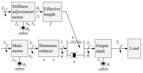 The variable stiffness joint drive system based on symmetrical crank slider mechanism is mainly composed of joint motor, harmonic reducer, input shaft, stiffness adjustment module, and output shaft. In the dynamic modeling, we should consider the electrical damping of the motor, the output damping, and the reduction ratio of the harmonic reducer. In addition, we should also consider the friction in the movement of crank slider mechanism and elastic deformation of spring bar, which will also affect the torque requirements of the actuator and the performance of the system. Combining the above factors, the dynamical model of the variable stiffness joint drive system is established as shown in Figure 13.