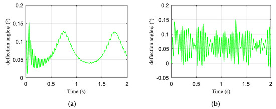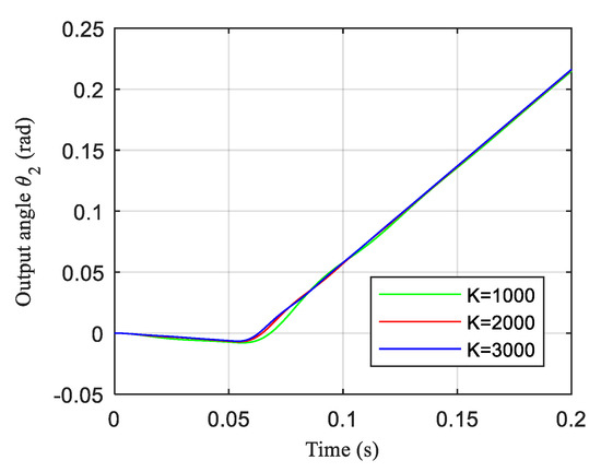 As can be seen from Figure 14, the joint output angle increases gradually from 0. When the stiffness of the joint is small, the response curve of the output angle of the joint with time will fluctuate greatly. When the joint stiffness is large, the curve of the output angle of the joint with time is close to the linear curve.