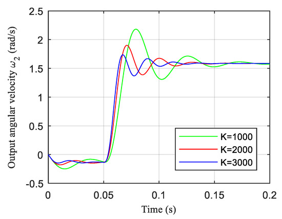 It can be seen from Figure 15 that the output angular velocity of the joint increases from 0 until it eventually stabilizes, but the whole process shows large fluctuation. When the stiffness is small, the angular velocity fluctuates greatly, which takes a long time to stabilize. When the stiffness is large, the angular velocity fluctuates less and the response speed is faster.