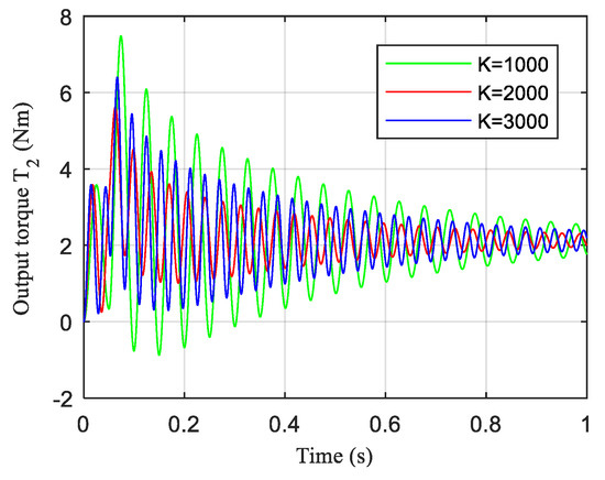 Assuming that the joint is subjected to a certain external load, , and input torque of main motor is rated torque, when the joint stiffness takes different values, the response curves of joint output angle, angular velocity and output torque are shown in Figure 14, Figure 15 and Figure 16 respectively.