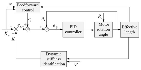 The feedforward control is to introduce the difference between the expected effective length and the actual effective length regulated by the stiffness adjustment motor into the control system. The feedback control is to introduce the difference between the expected stiffness and the actual calculated stiffness into the control system. The control of the rotation angle of the stiffness adjustment motor is a closed-loop feedback control with random disturbance . The stiffness adjustment motor is disturbed randomly, and the difference between the expected rotation angle of the stiffness adjustment motor and the actual rotation angle of the stiffness adjustment motor is , then we can get the expected torque of the stiffness adjustment motor by PID control. According to the dynamical model of stiffness adjustment motor in Equation (30), the rotation angle of stiffness adjustment motor can be controlled.