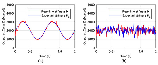 Real-time dynamic stiffness tracking curve. (a) The expected joint stiffness is a sine wave signal. (b) The expected joint stiffness is a random signal.
