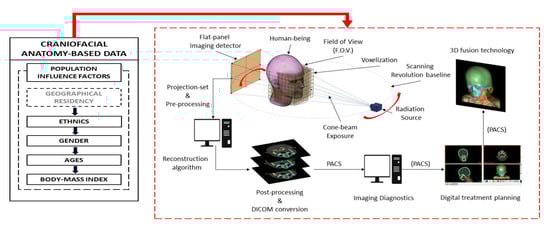 In addition to these impressive applications, CBCT is also recommended for use as a novel assistive tool in other medical branches, such as human craniofacial anthropometrics [], archaeology [] and forensics []. In comparison to conventional invasive methods, CBCT opens new frontiers for new application metric-assistive tooling, reducing costs, time, and improving productivity (De Donno et al., 2019) [] and (Hwang et al., 2019) []. In this field, there are two types of studying population samples: living human beings and cadavers.