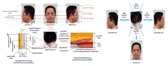 Corresponding to our selective anatomy analysis principle [], facial soft tissue structure (FSTS) principal featuring was technically analyzed and morphologically decomposed into three facial regions and four quadrants (Figure 2). The anatomy layering is simply described in Figure 2. According to Ref. [,,,], the most effective and widely accepted craniofacial morphologic landmarking was proposed in De Greef, S. et al. [], referred to Table 1. In the same study, a mass-populated sample of 510 females and 457 males of Caucasians was taken in craniofacial soft tissue thickness measurements that were used to update the contemporary Caucasian anthropometrics chart is updated and efficiently used in forensics and medical anatomy. Gender, ages, and body mass index (BMI) were systematically studied in correspondence. This has been indicated as a ground truth dataset for soft tissue and skin depth standardized inspections [,].