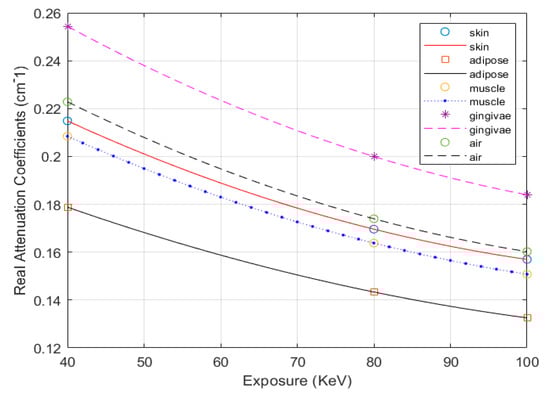 where: , while  and  are referred to as Tables 5.1, 5.2, B.1, and B.2 of ICRU Report 44 []. The new biophysical exposure attenuation coefficients of human soft tissue, in correspondence of PAM, are shown in Table 2 and Figure 4.