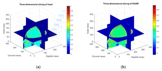 The three-dimensional construction was set as sagittal slice #180, coronal slice #180, and axial slice #100 (Figure 5a,b). The experimental segmented results were applied to the SA2IR reconstruction. The results of the proposed method were compared to the other active contour algorithms, including CVAC [] and MFS-CVAC [,]. The segmented facial skin cross-junctions results are shown in Table 4.