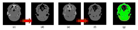Slicing of the realistic digital male head (RDMH), showing original and selective anatomy analysis iterative reconstruction (SA2IR) on the axial slice #80. (a) Original data; (b) SA2IR reconstructed data; (c) original Image; (d) original  only; (e) SA2IR Reconstruction; (f) SA2IR  only; (g), FSTS superimposition of (d,f).