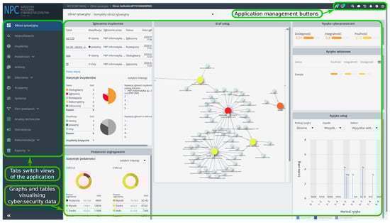 Example of a cybersecurity window. The menu tabs can be selected by either a computer mouse, or keyboard, while the graphs visualising data are scaled by touch screen events.