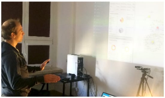 The development of a system to monitor cybersecurity of computer networks entails the necessity to create an interface enabling intelligent control of multidimensional visualisation of events occurring in cyberspace. Standard interfaces utilise keyboards and mice as input devices and computer monitors as output devices. Touchpads are also used, having the characteristics of both input and output devices. However all of those devices require that the operator be sited. Maintaining this pose during an eight-hour work-shift stresses the muscles and joints of the operator. As a result musculoskeletal disorders appear [,,,]. As a remedy frequent physical exercises are advised. However, that disrupts the normal functioning of the operator. To combine physical activity, requiring a change of body posture, with constant monitoring of cybersecurity events, an alternative way of commanding the system has to be used. As auxiliary input device’s cameras and microphones can be employed (Figure 2). The former enable gesture commands, while the latter enable voice commands. A multi-modal interface containing all of the mentioned input devices solves the health hazard problem and provides other opportunities, such as operator identification or an elegant way of presenting the network state to the onlookers. The main challenge of multimodal human–machine interface creation is to build reliable processing systems able to analyse and understand multiple communication means in real-time []. Majority of HCIs used in cybersecurity applications are the so-called Windows, Icons, Menus and a Pointer (WIMP) interfaces that utilise traditional keyboard, mouse and desktop setup [].