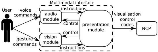 The general interface structure results from the requirements stated in Section 2.1 and the postulate of separation of concerns stemming from the list of good practices provided by software engineering. Both voice and gesture recognition require complex data processing, thus it is prudent to produce distinct modules dealing with each separately. In addition to that, there are no interdependencies between the two. As the commands coming from both sources have to be merged into one stream, and moreover, in the future new command sources might be needed, an interface structure with separate command channels and a presentation module aggregating commands resulted (Figure 3). In the current version of the interface, the presentation module integrates and subsequently transforms gesture and voice instructions into visualisation control codes accepted by the NCP. As a result the effects of those commands become visible on the screen. Thus the interface is formed out of three modules: audio, vision and presentation. Each one of them is built of embodied agents.