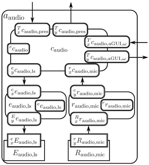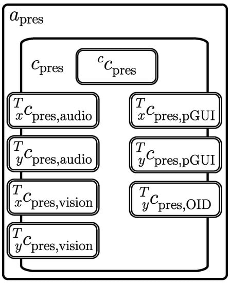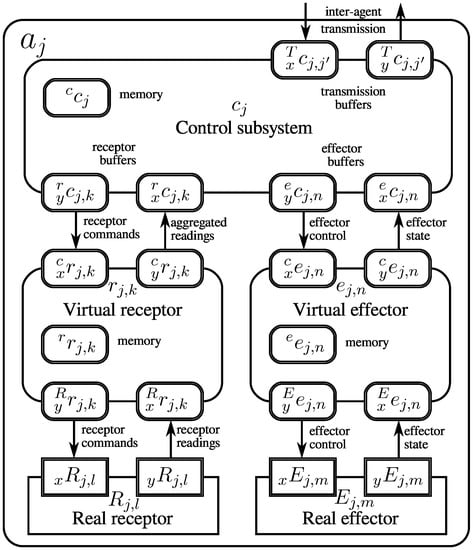 The embodied agent meta-model defines both the internal structure of the agent and its activities [,]. Figure 4 presents the general structure of an embodied agent , where j is substituted by the name of a particular agent. The agent  is composed of five types of subsystems: