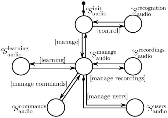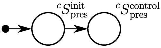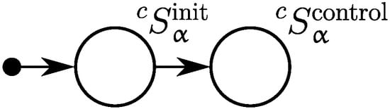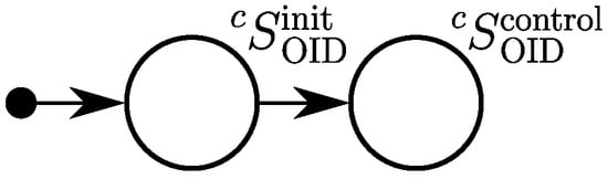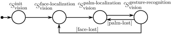The control subsystem  is governed by a two-state FSM (Figure 8). The behaviour associated with the state , initiates the memory of , and the one associated with the state  processes commands obtained from either the virtual receptor , aggregating data from the real receptors , or the presentation module. The commands from the presentation module are obtained through inter-agent communication buffers.