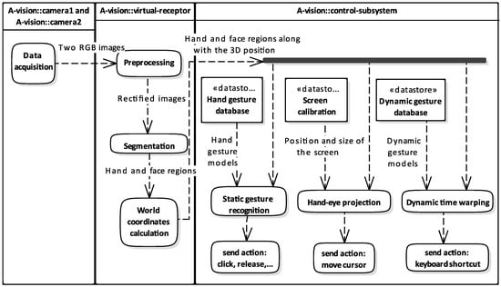 The structure of  is presented in Figure 7. It controls real effectors:  where  stands for mainPointer (primary cursor), secPointer (secondary cursor), or keyExecutor (keystroke generator). Those effectors respond to the commands generated by the control subsystem  in response to the stimulus activating the real receptors , where  stands for: mouse, keyboard or touch screen.