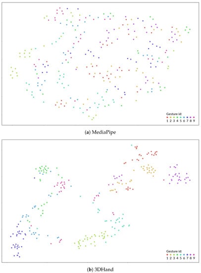 2D embedding of joints for the nine gestures with 30 samples for each, calculated using t-SNE. Joints calculated using the (a) MediaPipe and (b) 3DHand tools.