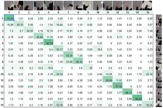 To further examine the possibility of using this technique giving the users the possibility to train their system on just a few samples we calculated the confusion matrix for all 15 gestures using a 5-NN classifier (Figure 35). Some of the gestures are easy to distinguish even with many different classes (such as gestures with identifiers 5 or 14), others are very hard cases, mainly the ones with no straight fingers visible (2, 3, 10). However, it is possible to pick the subset of few (around 6) gestures, that can be used to control the system.