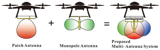 Due to the increased UAV market size and usability, the analysis of UAV-to-infra [1] and UAV-to-UAV [2] communication environments for U2X communication has been conducted, and various UAV antennas have been proposed [3,4,5,6,7,8,9,10]. In [3], the proposed microstrip magnetic dipole antenna is attached to the landing gear of a multicopter drone. Although the antenna has space efficiencies in the antenna placement, it has a large size and a null due to the characteristics of the conical beam. Refs. [4,5] have a low-profile small size, but due to a limited beam coverage, they are not suitable for performing robust U2X applications. Refs. [6,7] operate in the frequency band (5.03–5.15 GHz) dedicated to UAVs and can achieve wide elevation angle using the configuration of the proposed feeding network. However, it is difficult to provide hemispheric beam coverage. In addition, the rectangular box-shaped structure is not suitable for a structure for minimizing aerodynamic resistance. Refs. [8,9,10] have high gain characteristics exploiting pattern multiplication, but the beam coverage is limited. In particular, Ref. [10] has a wide beam coverage, but a fade zone exists near the elevation angle of 0, where the beampattern synthesis is perpendicular from the center of the antenna array. In [11], the antenna has a low-profile characteristic, but the antenna configuration is complex and its weight is heavy due to metal substrates. It is characterized by the ability to tilt the beam in the desired direction using the adjustment of diodes or a feeding network, but several modes can make antenna beam control difficult [12,13,14]. In this paper, we proposed a beam-reconfigurable multi-antenna system with beam-combining technology for U2X communications of UAVs. The proposed multi-antenna system with different beams is electronically controlled by the proposed feeding network, releasing the reconfigurable beams in four different directions. When the areas covered by these beams are combined, they achieve a hemispherical coverage. In addition, the proposed antenna is suitable for UAV flight due to its simple structure and a light-weight characteristic, and it covers both UAV ground control frequency (5.03–5.09 GHz) and UAV mission frequency (5.091–5.15 GHz) bands. Therefore, it is essential to establish a robust U2X communication technology by applying it to various UAV applications.