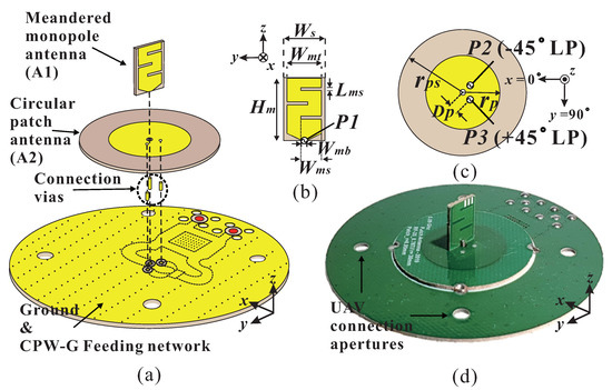 - Wu, D.; Chen, X.; Yang, L.; Fu, G.; Shi, X. Compact and Low-Profile Omnidirectional Circularly Polarized Antenna With Four Coupling Arcs for UAV Applications. IEEE Antennas Wirel. Propag. Lett. 2017, 16, 2919–2922. [Google Scholar] [CrossRef]