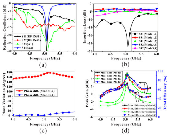 Figure 4 shows the performance of the proposed multi-antenna system with regard to the input ports. The measured reflection coefficients at Mode 1 is described in Figure 4a. Based on the 10-dB impedance bandwidth, it covers the UAV operating frequencies from 5 GHz to 5.5 GHz. Figure 4b shows the insertion loss for each mode. At 5.09 GHz, the minimum and maximum of the insertion loss within the operating frequency band are approximately 3.4 dB and 4.7 dB, respectively. They include a power divider loss of 3 dB, a SPDT switch insertion loss of 1 dB, and a path loss of microstrip line. Figure 4c shows the measured phase variations with regard to the RF INs. The phase difference between modes 1 and 2 at 5.09 GHz is approximately 180, and the phase difference between modes 3 and 4 is approximately 0. Figure 4d describes the measured peak gain and total efficiency of each mode with regard to the frequency band. All four modes have the highest performance at 5.09 GHz, and the maximum gain and total efficiency are approximately 5.8 dBi and 76%, respectively.