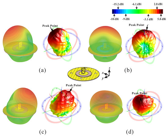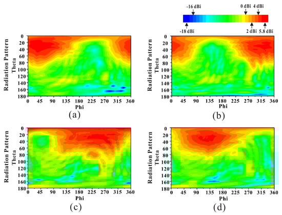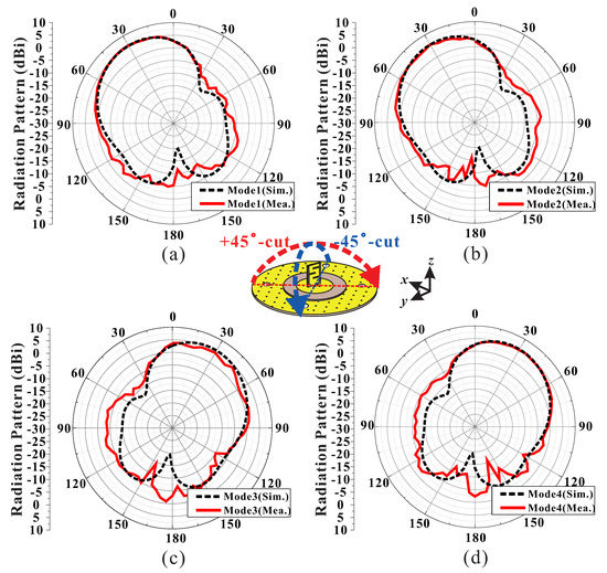 Measured radiation patterns with regard to the azimuth plane at the input modes: (a) Mode 1, (b) Mode 2, (c) Mode 3, and (d) Mode 4.
