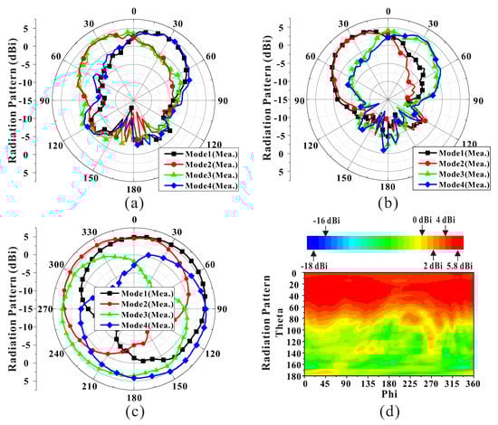 Figure 5 shows the simulated and measured results of the radiation patterns at each mode in the elevation planes (+45 and −45). In Figure 5a, the boresight direction of Mode 1 is = 30 in the +45 elevation plane. Peak gain and HPBW at that mode are approximately 5.8 dBi and 72.5, respectively. In the +45 elevation plane, the radiation pattern at Mode 3 is shown in Figure 5c, and the boresight direction of , peak gain and HPBW are approximately 30, 5 dBi, and 77.5, respectively. Mode 1 and Mode 3 radiate in opposite directions from the azimuth plane. The radiation pattern at Mode 2 is described in Figure 5b. The boresight direction, peak gain and HPBW on the −45 elevation plane are approximately 30, 5.7 dBi, and 72.5, respectively. In Figure 5d, the radiation pattern at Mode 4 is described. The peak gain and HPBW on the −45 elevation plane are approximately 35, 5.4 dBi, and 77.5, respectively. Modes 2 and 4 radiate in opposite directions from the azimuth plane. Figure 6 and Figure 7 show measured results of radiation patterns at four modes. Figure 6 shows simulated and measured three-dimensional (3D) radiation patterns for each mode. There was good agreement between the simulated and measured results of the implemented proposed antenna system. Figure 7 shows the measured radiation patterns with regard to the azimuth plane at the input modes. Figure 6a and Figure 7a show the radiation pattern of Mode 1, the peak gain is approximately 5.8 dBi at = 30 and phi = 45, the HPBW () is approximately 72.5 from −2.5 to 70, and the HPBW () is 165 from 317.5 to 122.5. The total efficiency of Mode 1 is approximately 76%. Figure 6b and Figure 7b show the radiation pattern of Mode 2. The peak gain is approximately 5.7 dBi from = 30 and = 310, the HPBW () is 72.5 from –2.5 to 70, and the HPBW () is 165 from 242.5 to 47.5. The total efficiency of Mode 2 is 74%. Similarly, Figure 6c and Figure 7c show the radiation pattern of Mode 3. The peak gain is 5 dBi at = 30 and = 225, the HPBW () is 77.5 from −2.5 to 75, and the HPBW () is 190 from 135 to 325. The total efficiency of Mode 3 is 70.5%. Furthermore, Figure 6d and Figure 7d show the radiation pattern of Mode 4. The peak gain is 5.4 dBi at = 35 and = 135, the HPBW () is 72.5 from −2.5 to 75, and the HPBW () is 160 from 47.5 to 207.5. Total efficiency of Mode 3 is approximately 73.3%. From these results, four modes show a beam-reconfigurable characteristic in which beam is tilted about 90 according to mode change. The minimum gain and total efficiency of four modes, the HPBW (), and the HPBW () are 5 dBi, 70.5%, 72.5, and 160, respectively.
