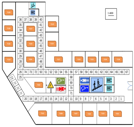 The user divides the collection space into several smaller grids, where the size of each grid is determined as 1 m2 and 4 m2 centred at the collector. The size of the grid can affect the accuracy of positioning. That is, the denser the grid area, the higher the positioning accuracy is and the longer the time required to collect the signal samples is. The environment setup for a floor map with 74 reference points is shown in Figure 2. For the experiments, the RSSI data collection and experiments were carried out on the seventh floor of the Engineering Building of Dongguk University, Seoul, Korea. The 52 × 32 m area was divided into 74 reference points (RPs), and the interval between any two RPs was 2 m. For the hardware, we adopted the Dell Alienware model P31e as the positioning server. Meanwhile, a Samsung SM-E310K smartphone was used to measure the RSSI values of the available APs on each RP. In terms of the software, the RSSI database, data preprocessing process, deep-learning classifier and online experiment programme were constructed using Python and the TensorFlow platform.