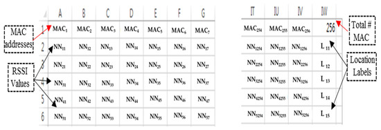 In our work, the deep-learning code was designed for comma-separated value (CSV) input files; hence, we converted the collected data files into CSV files for training and testing. The training and testing CSV files contained 257 columns. In column 257, a total of 74 RPs were used as labels. As shown in Figure 3, the NN represents the RSSI value. For each RP, the AP has a unique media access control (MAC) address. The programme sets each MAC address that can be detected into a separate column. At the same time, the corresponding RSSI values are placed under the MAC addresses. In the process of filling all the RSSI values of the RPs into the corresponding MAC addresses, if the RSSI values of certain MAC addresses do not exist in a certain RP, the corresponding MAC columns are filled with zeros. When the programme arranges all the RSSI values of the 74 RPs into the corresponding MAC columns, if the total number of columns in the CSV file is less than 256, the remaining columns are filled with zeros. If the total number of columns is greater than 256, the MAC address column with the lowest RSSI value is deleted. If the total number of columns in the final CSV file is equal to 256, the reference data set is complete.