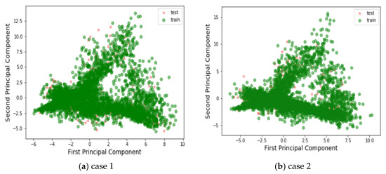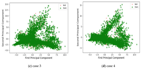 The principal component analysis (PCA) plot for training and test data is shown in Figure 5. In the Figure 5, graphs a–d correspond to four different positioning cases for the side-information-aided preprocessing scheme. The green points in the figure represent the reference points in the training database, and the red points represent the unknown location points (test data set). We analyze the numerical characteristics of the unknown points in the test database, and then compare them with the RP characteristics in the trained classifier. As shown in Figure 5, the green point closest to the red point is considered the final positioning decision.