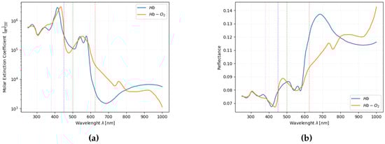 Plots visualizing optical absorption and reflectance of Hb and HbO, vertical dashed lines are related to human perception of colors associated with (). (a) Molar extinction coefficient () related to absorbance over wavelength () considering 15 g/dL of hemoglobin concentration and 1 cm cuvette. (b) Derived reflectance plot of absorbance under same constants.