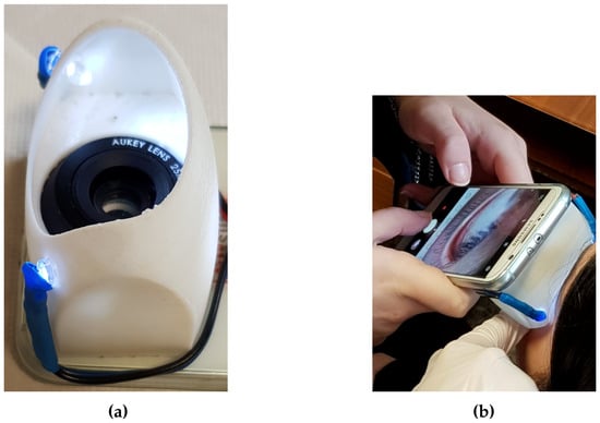 (a) The acquisition device consists of a special spacer and a macro lens to acquire images with a high-resolution smartphone at close range; (b) the moment of the acquisition of an image of the conjunctiva.