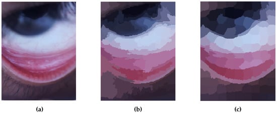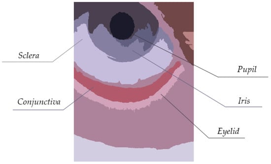 In Figure 3, the original image is processed with a three-dimensional (R, G and B) space and in the last picture with a five-dimensional model including both color and spatial features. In the latter, there is not an increase in computational complexity since the only calculation affected is the distance function. However, in each digital image analyzed, the intra-cluster variance is minimized efficiently with properly outlined boundaries in between each group of pixels. The classified instances closer to mucocutaneous junction are noisy in the first approach, while on the second one each semantic class (iris, pupil, sclera, eyelid, and conjunctiva) appears as a compact union of clusters.