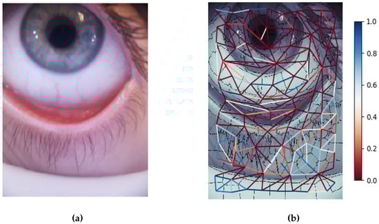 (a) Acquired sample; (b) region adjacency graph (RAG) displaying a measure of similarity between each region. The center of each node is considered a vertex. For each connection between two regions, there is an associated colored line according to the measure of similarity.