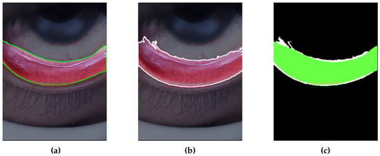 (a) Manually segmented conjunctiva used as ground truth. (b) Automatically segmented conjunctiva obtained by the proposed approach. (c) Visualization of the overlapping between green ground truth image and white automatically segmented image ().