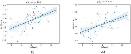(a) Linear regression and strength of correlation between a* from manual segmentation and Hb g/dL standardized vectors. (b) Linear regression and strength of correlation between a* from automatic segmentation and Hb g/dL standardized vectors.