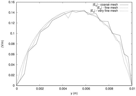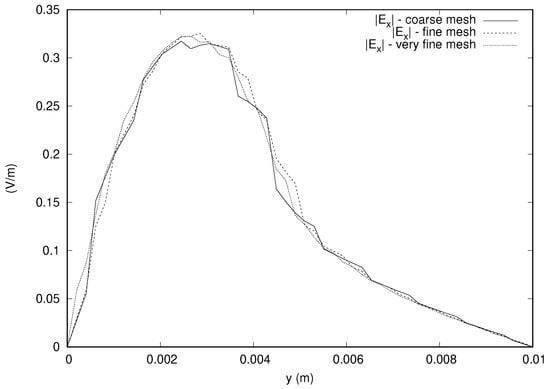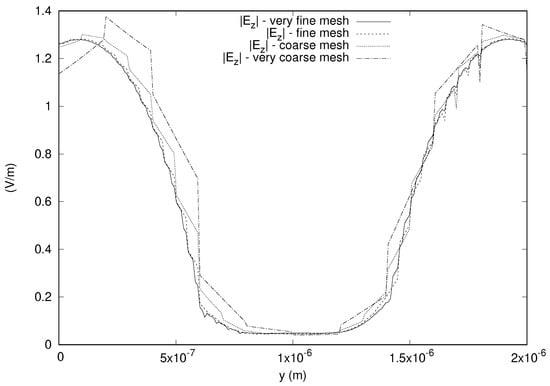 The outcomes related to the stability of the results of the simulations are shown in  Figure 3 by plotting the magnitude of the z component of the electric field along a line parallel to the y axis and passing through the center of gravity of the domain. The difference between successive refinements progressively decreases, and the fine and very fine meshes give stable solutions. The well posedness and convergence result that was predicted using the theory guarantee that our solutions are reliable.