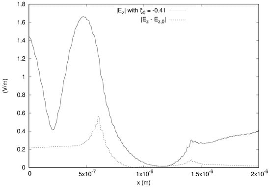 The magnitude of the z component of electric field along a line parallel to the x axis and passing through the center of gravity of the domain, for the problem involving the medium in []. The plot for the magnitude of the field  obtained in the bianisotropic case using  is shown along with the magnitude of the difference between the two solutions , where  is obtained using .