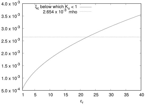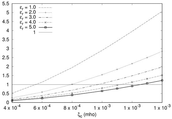 Since the right-hand side of Equation (30) also depends on  due to the presence of  in the expression for , we do not have a closed-form expression on the limit on  below which H7 is satisfied. However, a graphical analysis can be done for estimating such a limit on , as shown in  Figure 1. The value of  is varied in the range , whereas  assumes values in the range . It can be observed that for a fixed value of , the range of  over which H7 is valid steadily decreases as  increases. As for the dependence on , the corresponding range increases when the medium becomes lossier due to higher , as expected.