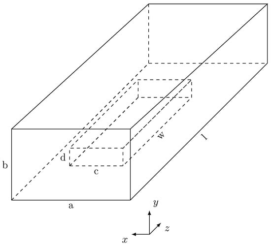 Now, we consider a specific numerical problem for which the solution is calculated using our finite element simulator. A rectangular waveguide with a discontinuity due to a block of bianisotropic medium is considered as shown in Figure 8. In the simulation, the rectangular waveguide is characterized by  mm,  mm and has a length  mm. The obstacle is a parallelepiped with  mm,  mm and a length  mm. The origin of the axis is at the lower right corner of the near face of the waveguide shown in Figure 8. The obstacle ranges from  mm to  mm along the x axis, from  to  mm along the y axis, and from  mm to  mm along the z axis. The bianisotropic medium making up the obstacle is characterized by  and  mho. For this medium, , and also, Equation (45) is satisfied; hence, all the hypotheses required to guarantee the well posedness and convergence of finite element solutions hold true. The waveguide is excited with  mode having an amplitude of 1 V/m and a frequency of 9 GHz. The input port is on the x-y plane, and the output port is closed on a matched homogeneous admittance boundary condition for the  mode in the empty waveguide.