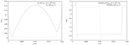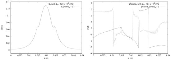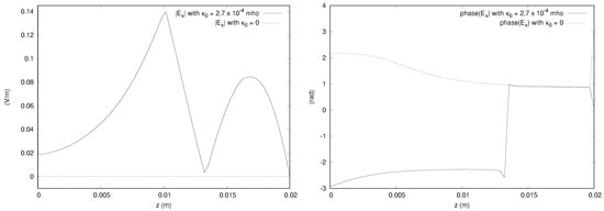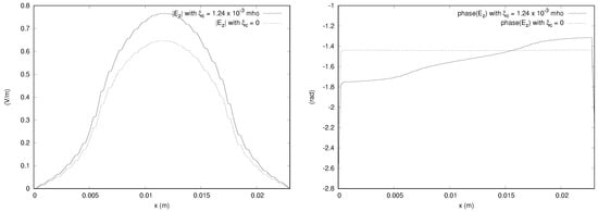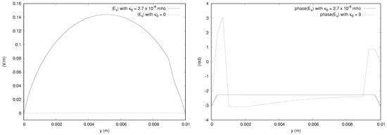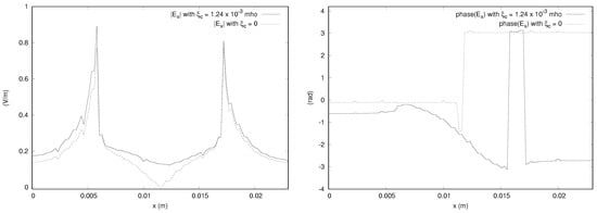We provide the magnitudes and phases of the x component of the electric field obtained from the  simulation in Figure 15, Figure 16 and Figure 17. The bianisotropy causes a difference in magnitude of up to 14% of the incident field. The phases are also significantly affected by the bianisotropy of the medium. The figures for other components are not shown to save space, but it is noted that the y component is affected by the bianisotropy, showing a difference of up to about 10% of the incident field. The z component of the field along the line parallel to the x axis passing through the center of gravity of the domain does show a difference of about 10% of the incident field, but the magnitudes along the other directions are close to zero for both values of  considered.