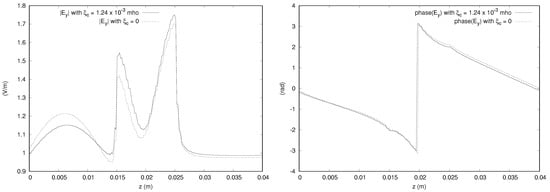 The magnitude and phase of the z component of the electric field along a line parallel to the x axis and passing though the center of gravity of the domain for problem involving the medium in []. The plot for the bianisotropic case using  mho is compared with the solution obtained in the isotropic case using .