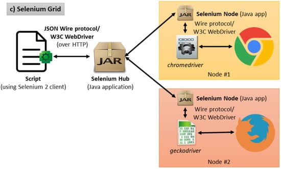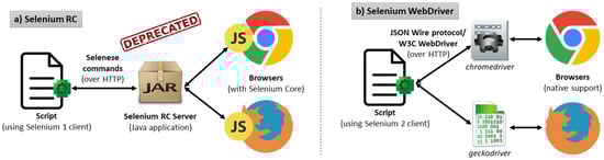 Although Selenium RC was a game-changer in the browser automation space, it had significant limitations. Since JavaScript was the base technology to support automated web interactions, different actions could not be performed, for example, file upload and download, or pop-ups and dialogs handling, to name a few. Moreover, the Selenium RC Server introduces a considerable overhead which impacts in the final performance of the test. For these reasons, Simon Stewart at ThoughtWorks developed a new tool called Selenium WebDriver, first released in 2008. From a functional point of view, WebDriver is equivalent to RC, that is, it allows the control of browsers from scripts using different language bindings []. Nevertheless, its architecture is entirely different. To overcome the limitation of automating through JavaScript, WebDriver drives browsers using their native automation support. To that aim, a new component between the language binding and the browser needs to be introduced. This component is called the driver. The driver is a platform-dependent binary file that implements the native support for automating a web browser. For instance, this driver is named chromedriver in Chrome or geckodriver in Firefox (see Figure 1b). The communication between the Selenium client and the driver is done with JSON messages over HTTP using the so-called JSON Wire Protocol. This mechanism, proposed initially by the Selenium team, has been standardized in the W3C WebDriver recommendation []. Nowadays, Selenium WebDriver is also known as “Selenium 2”, while Selenium RC and Core are known as “Selenium 1”, and its use is discouraged in favor of WebDriver.