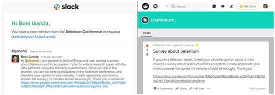 We employed two different ways to recruit participants for the survey. First, we used the general channel of the SeleniumConf Slack workspace (https://seleniumconf.slack.com/). Participants in this channel are former or future participants in SeleniumConf. Therefore, the potential respondents coming from this workspace are likely to be experts (or at least quite interested) in Selenium. The left part of Figure 3 shows the message posted on this Slack channel. To reach a wider audience, we also ask for participation in the survey in the Selenium Reddit community (https://www.reddit.com/r/selenium/). People participating in this community show a proactive interest in Selenium, and therefore, their opinion can also be valuable for the survey. The right part of Figure 3 shows the message posted on the Selenium Reddit community.