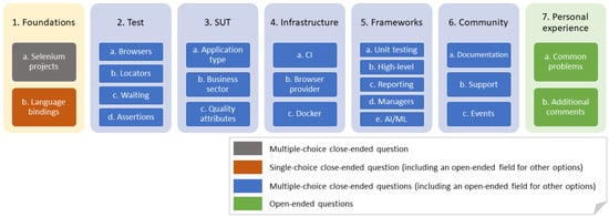 The next part of the survey is labeled as “SUT” in Figure 4. This part first surveys the nature of the application tested with Selenium. Although the answer to this question seems pretty obvious since Selenium is a test framework for web applications, we ask the participants this question to evaluate if other application types are also assessed (for instance, mobile apps, when also using Appium). In the next question, we ask about the business sector in which the participants catalog their SUT, such as enterprise applications, e-commerce, or gaming, to name a few. Moreover, we ask the participants to inform about the quality attributes verified with Selenium, for example, functionality, performance, compatibility, usability, accessibility, or other non-functional properties [].